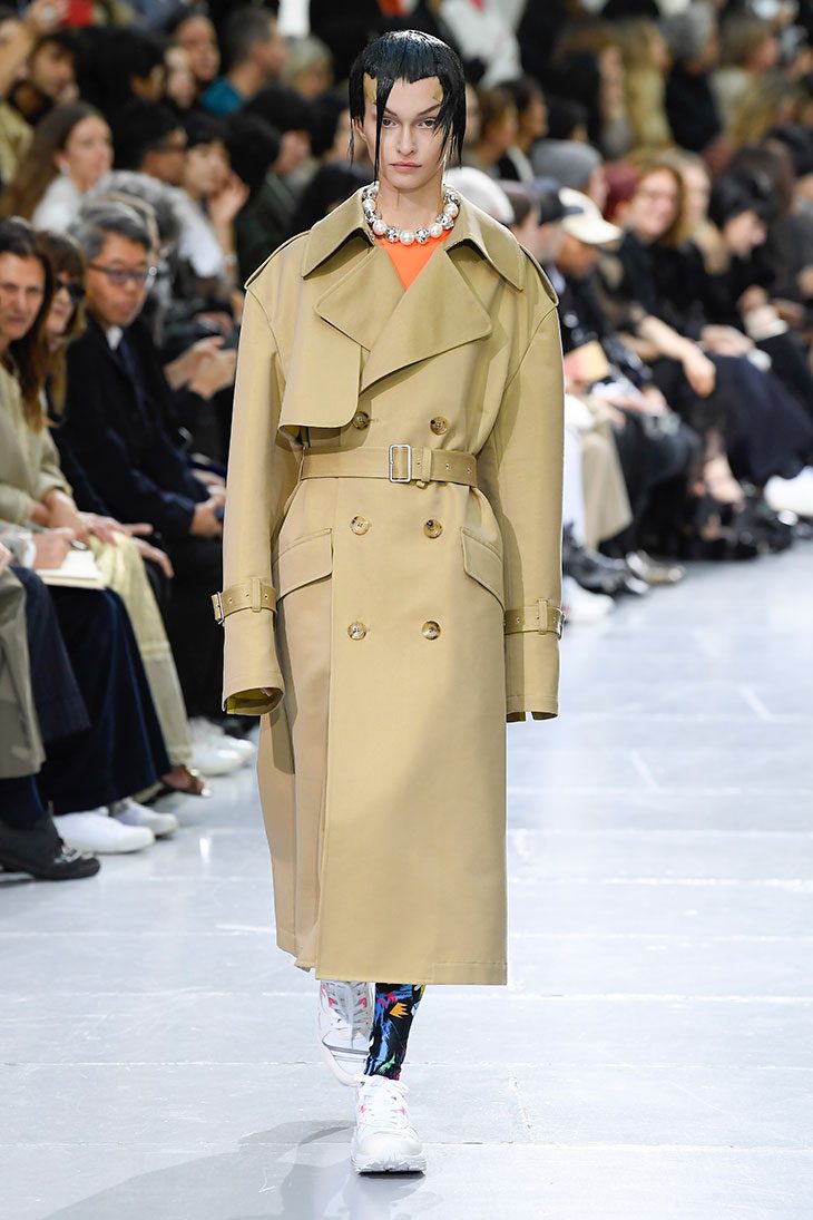 The starting point of the collection is a trench coat, and its conceptual deconstruction. The designer explores the dozens of different ways how to turn a trench into a maxi dress, an apron, tailored jackets, pencil skirt, suit, cape, trousers, and even a ball gown.