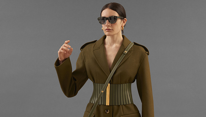 “Uniforms get sinuous, armors get fluid. Field jackets are deconstructed by strategically placed buttoned openings that allow to remount them in unpredictable directions. Elasticated belts, as anatomical as they are defensive, cinch the waist of martial coats, robes and military shirts. Unbuttoned dresses mould to the body, angular draping is pasted onto crude dresses like ultra feminine memories of other times and silhouettes. Bathing suits function as impromptu bustiers.