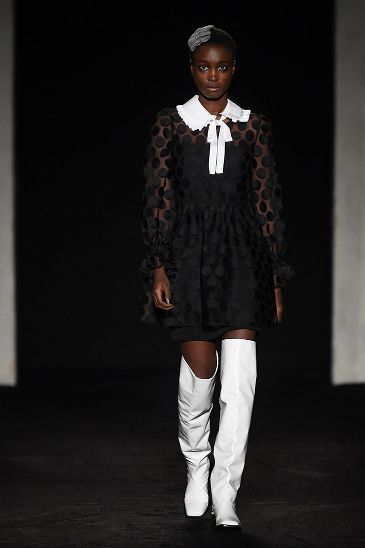 As in an old-time diorama, daytime and nocturnal landscapes depicting the countryside are embroidered on ample cocooning coats embellished with faux fur patchworks or transformed into figurative appliques on colorful and festive tops. Houses and bell towers, meadows and forests, sun and clouds, stars and fireflies become un new miniature camouflage motif printed on wide flounce dresses or on coats’ linings.“