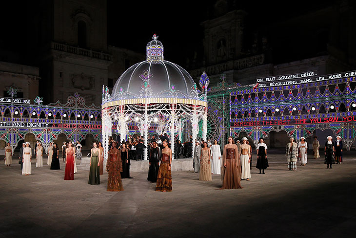 Maria Grazia Chiuri presented Dior Cruise 2021 collection with a striking spectacle in Lecce, Italy, a region close to her heart. She has selected the Piazza del Duomo for the location of the audience-free presentation.