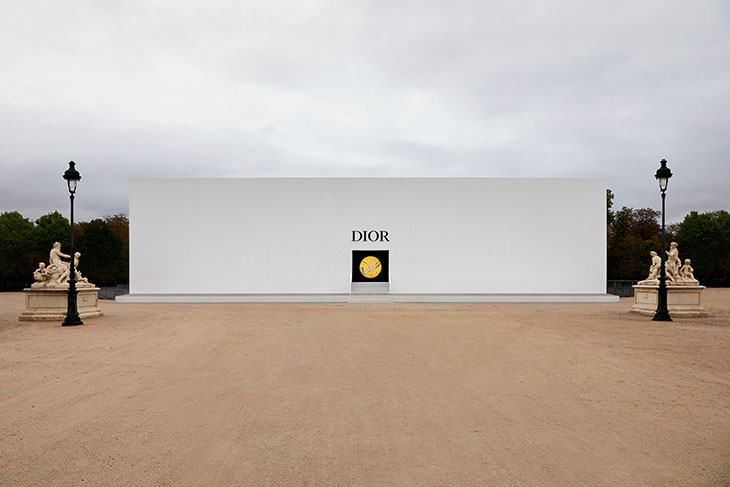 Discover the Dior Spring Summer 2021 atmospheric show space featuring a previously unrealized work by Italian visual artist Lucia Marcucci. Named ‘Vetrata di poesia visiva’, the scenography was made as a collage of illuminated imagery and text in the manner of stained glass windows.