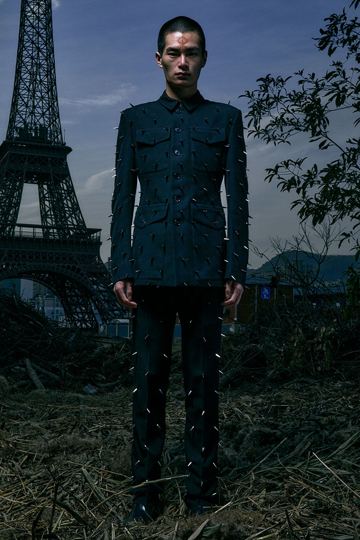 The collection continues the cold and sharp style from previous seasons. The metal spikes, buckled leather straps as well as the cilices meticulously hidden around the waist, may all seem to be terribly aggressive. But in fact, the aggressions are directed at the wearer himself, symbolising self-punishment. If this world-wide pandemic is nature’s punishment for the human race, then self-punishment is to offset sorrow with sorrow. – from Sankuanz.