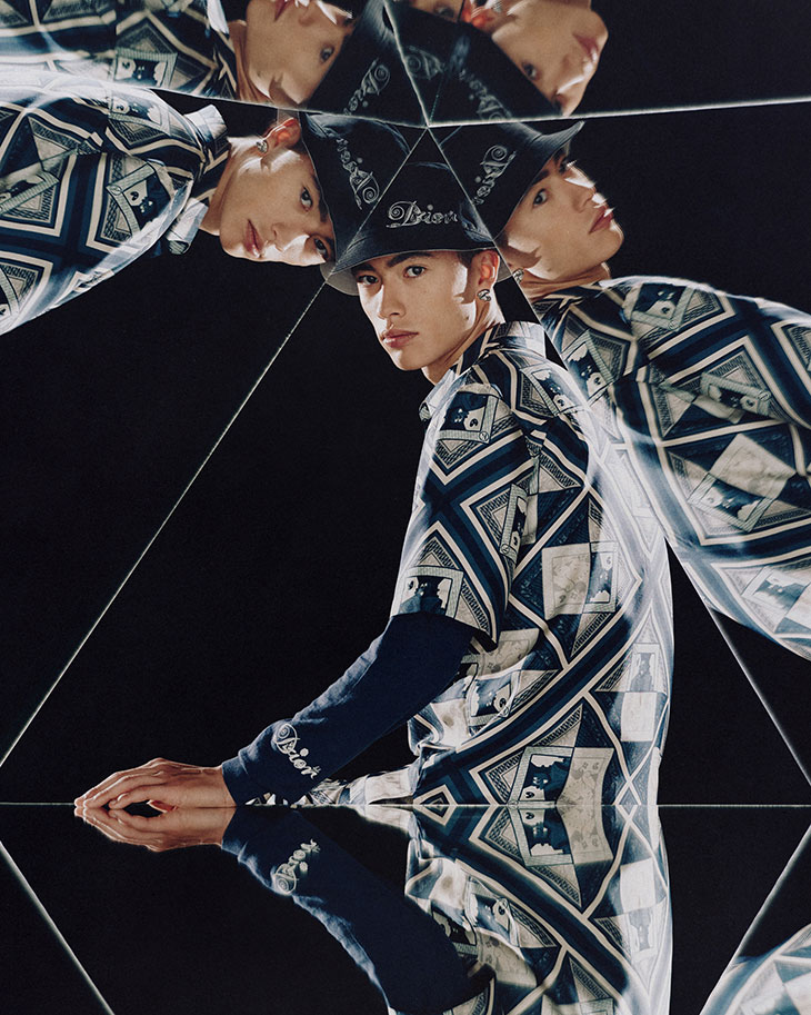 Fusing Dior heritage with the American artist’s surrealist pop aesthetic, pink and blue card symbols in the House’s signature ‘Dior Oblique’ motif adorn a series of sporty essentials offset with jewelry, scarves and a bob hat embroidered with the “Dior” signature.