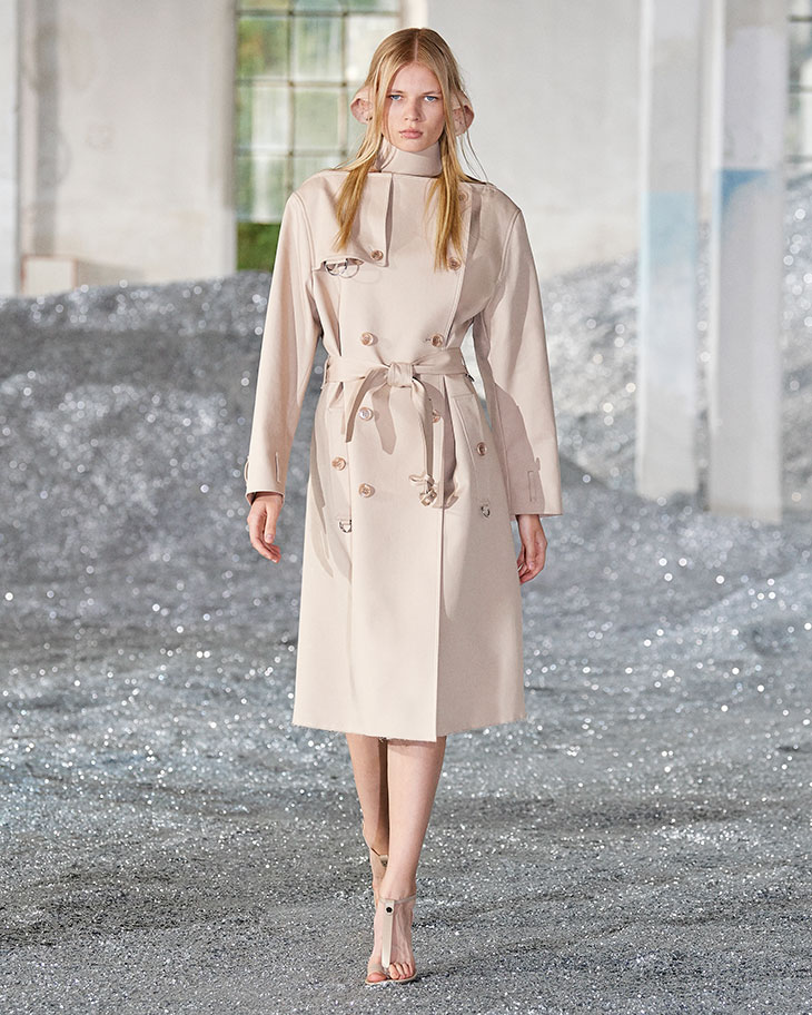 With each new collection for Burberry, Riccardo Tisci brings a new take on the iconic Burberry trench coat. Playing with the volume, this season the coat is deconstructed and rebuilt in strong and striking silhouettes. The classic Burberry gabardine and textural linen cotton are cropped at the back to reveal swimsuits animated with abstract prints. Signature outerwear in soft fawn and a dark biscuit shade is transformed through daring detailing, from exaggerated lapels to chain-link embellishments, sleeveless proportions to raw hems. A sense of fluidity is brought to the trench and car coat through fluted and oversized sleeves on collarless and hooded shapes, plus capelets that are perforated or trimmed with leather.