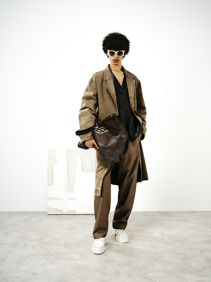 Through voluminous plays on proportion and layered styling, such as large knits and leather gilets paired with fluid trousers, garments provide comfort, cover and a sense of belonging, irrespective of time. Craftsmanship takes center stage with sophisticated techniques and artisanal details, including leather-woven patterns, intricate quilting, whipstitching and double-studded accents across multi-functional designs, from B-Chain bags to cut-out clogs. New streamlined footwear include unisex moccasins with 1851 hardware and essential sneakers in heritage red. – from Bally.