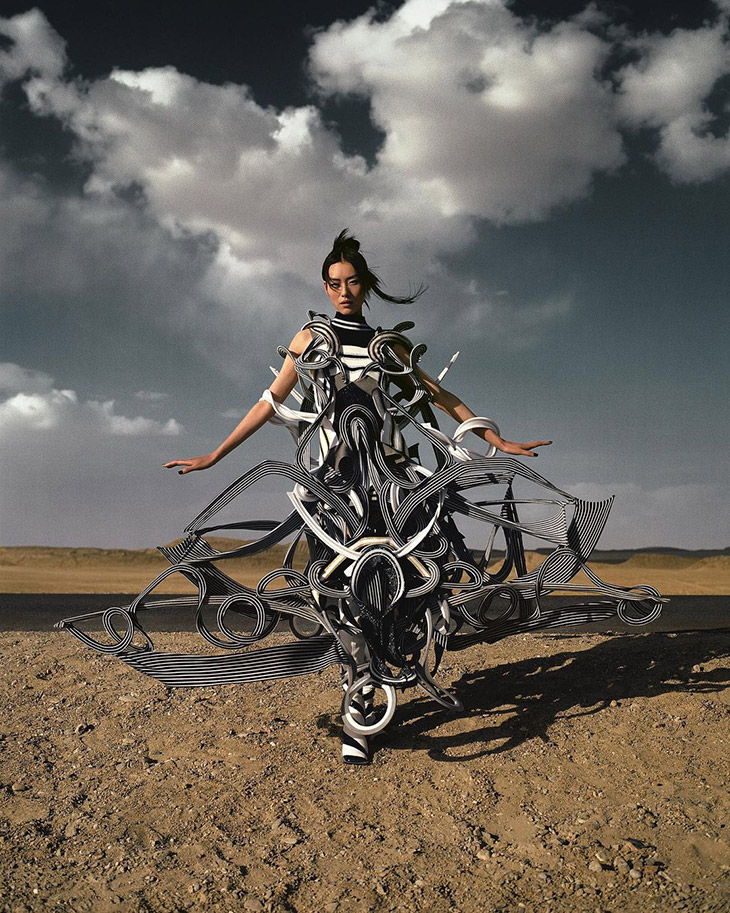 Supermodel Liu Wen takes the cover story of Vogue China‘s November 2021 edition lensed by fashion photographer Leslie Zhang. In charge of styling was Audrey Hu, with beauty from hair stylists Nate Peng and Bon Zhang, and makeup artist Yooyo Keong Ming. For the cover story, captured at Qinghai, Liu is portraying a storm-chaser, who explores the powerful and terrifying forces of nature and wild beauty.