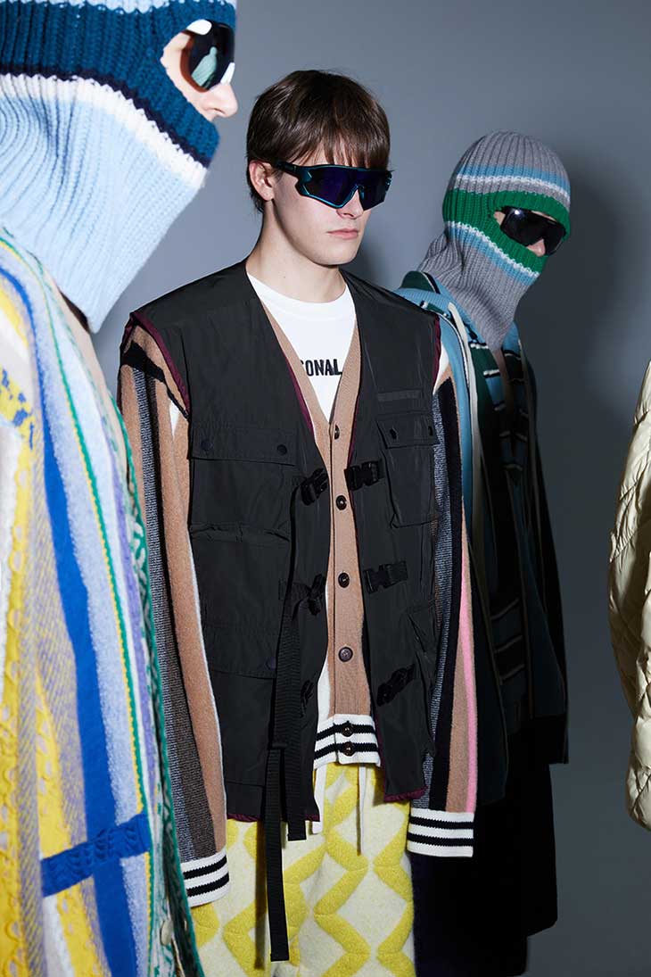 The collection is a melting pot of winter and warm fabrics such as velvet and technical wool pieces and knitwear bermudas and sandals worn with heavy and thick wool socks. Knitwear and wool are combined with technical fabrics applied to outdoor styles including nylon parkas and fisherman jackets.