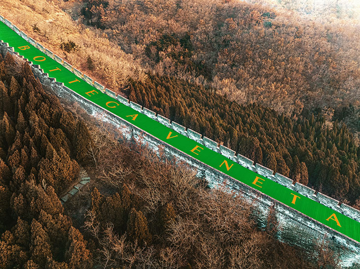 To celebrate the upcoming Chinese Lunar New Year, Bottega Veneta is taking over part of the Great Wall of China from 6 to 12 January 2022. The installation features the Bottega Veneta’s name and logo in its signature green, with a tangerine shade of orange, known as a symbol of luck in Mandarin. The brand has also displayed a festive message ‘????’ (Happy New Year!) on a monumental digital screen.