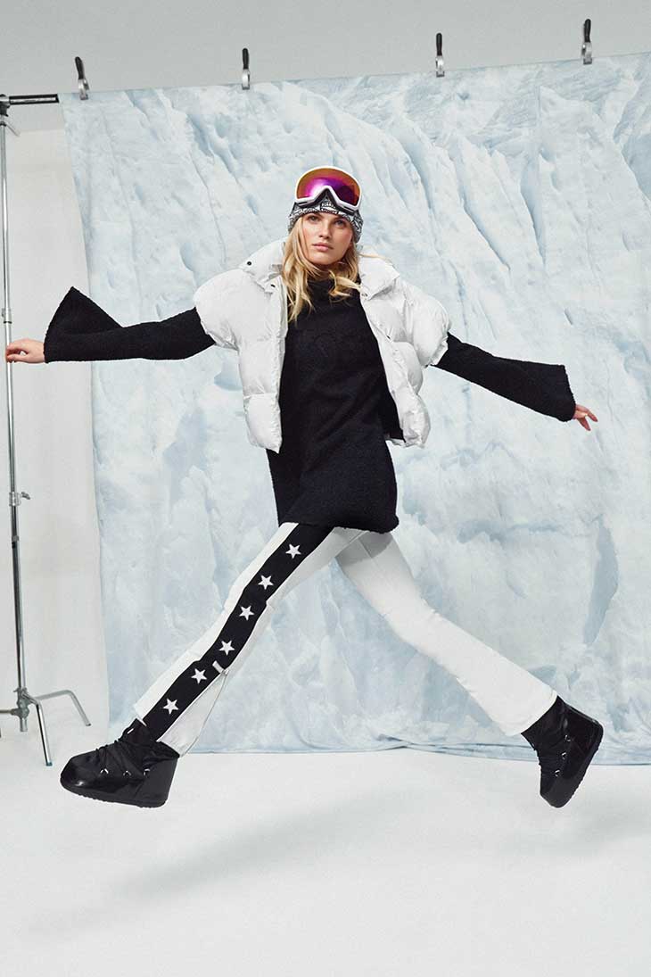 The collection shines with a new light thanks to the new gold and diamond families enriched by lurex yard and metallic garments. The animal print merges jaguar and zebra patterns for her, with a darker ton-sur-tone version of the feline pattern for him. The multi- foil family remains a highlight in both collections, with the introduction of the blue-black style alongside the iridescent garments. Knitwear is made special by jacquard and intarsia techniques. No need to say, ski wear remains the focal point of the collection, with the best performance features. – from Jet Set.