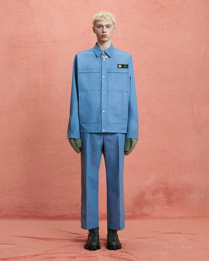 The silhouette is geometric, precise, and angular both in tailoring and pressed workwear shapes. Lines of contrast topstitching reinforce the form at the center front, adding elongation, or framing functional details as pockets and seamwork. Shirt overlaps petal over lapels and front openings, stovepipe stand collars give structure while extending high on the neck. Round, pillowy down coats, with and without utility pocketing, in leather or in recycled nylon, create both comforting softness and substantial volume. – from OAMC