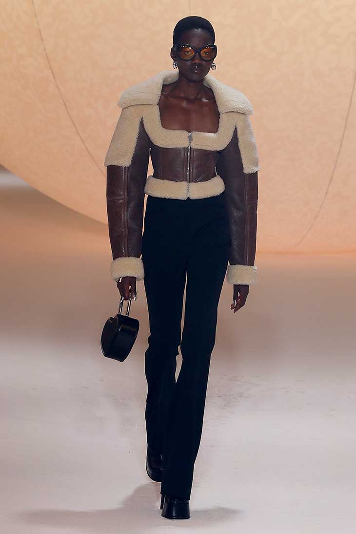 Fashion designer Yoon Ahn presented AMBUSH® Fall Winter 2022.23 Collection with a show held on February 26th, as a part of the ongoing Milano Fashion Week. For this season, designer mixes her lived experiences with her otherworldly reference points, in order to further define brand’s retro, future, romantic universe. The silhouettes are extended with cartoonish platform shoes and fluffy outsized hats. Designer also moves away from entirely oversized shapes and brings a more boxy looks. Strong and square-shouldered outerwear contrasts with skinny, slightly flared pants (or no pants at all) for women and an overly long straight leg for men. Brand’s signature outerwear like cropped moto jackets and blazers, are updated with shearling erupting from sleeves and collars to give a 70s accent.