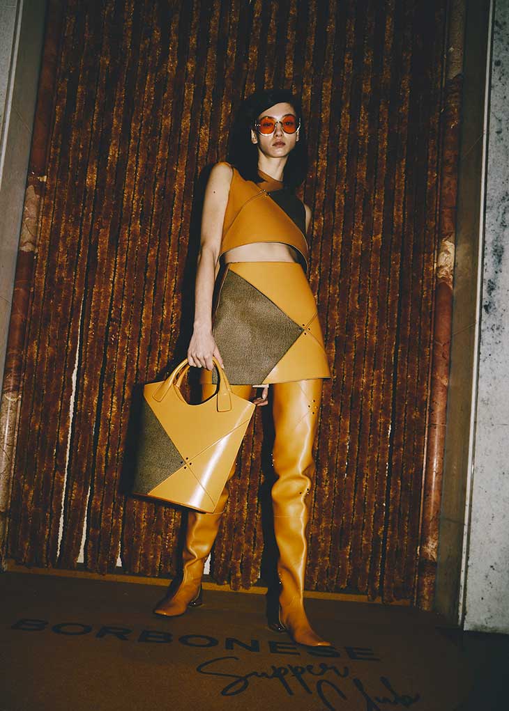 Designers Dorian Tarantini and Matteo Mena presented BORBONESE Fall Winter 2022.23 Womenswear Collection, with a presentation held today at Palazzo Confalonieri as a part of Milano Fashion Week. The collection brings a glamorous sense of elegance and an incisive, graphic spirit, with the tactile sensuality that is the Borbonese signature. Titled The Borbonese Supper Club, collection completely matched the presentation venue with nocturnal, seductive and sensual pieces in forest green, mustard, tabasco and chocolate shades. Leather is the protagonist, brushed and cut into large lozenges held by small metal screws on A-line coats, trapeze dresses, mini-skirts. Silhouettes are graphic; the body is revealed, but always covered: with printed tights and thigh-high boots. The Borbonese language expands in the choice of materials and possibilities of use, dialoguing with a new and transversal audience.