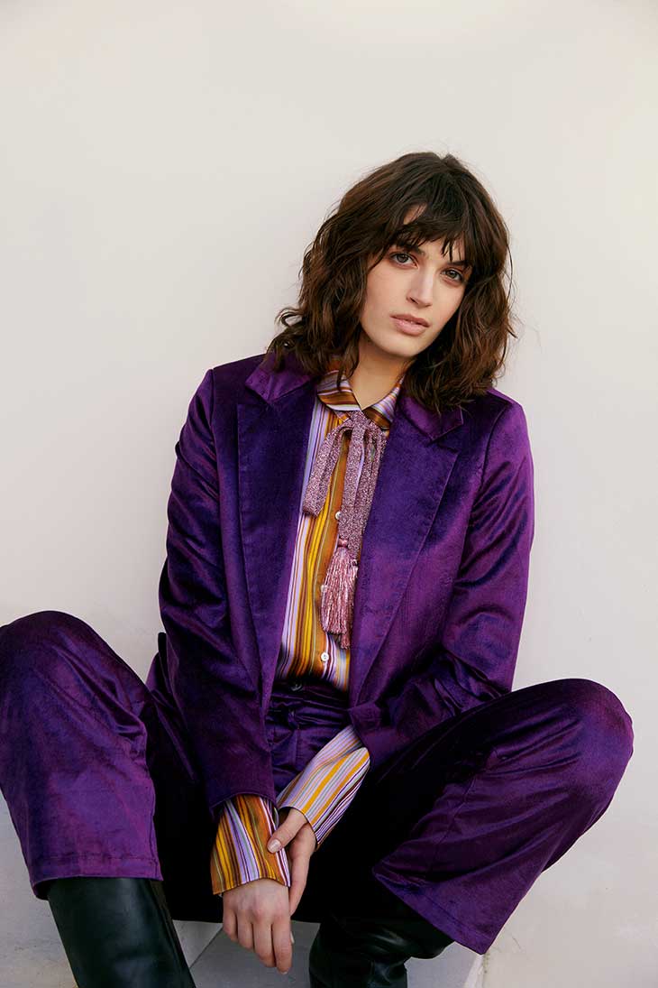 Elegance and comfort accompany the winter atmosphere, where the anticipation of summer is found in camouflower prints of herbs and flowers on silk twill, while ecoprinting-style designs evoke bouquets collected and left to dry between the pages of a newspaper as a souvenir. Relaxed, enveloping silhouettes feature kaleidoscopic botanical motifs of berries, acorns and small squirrels, while the cells of a beehive inspire geometric shapes with a retro vibe on long shirtdresses and maxi shirts. The gentle shades of twilight become an invitation to relax, which is reflected in silk dresses and shirts to pair with soft bouclé knitwear in organic wool and sustainable alpaca. Prints on crêpe de chine capture the glow of the northern lights and draw inspiration from elements of Nordic folk art such as Dala horses, also featured on romantic jacquard knits. – from press release