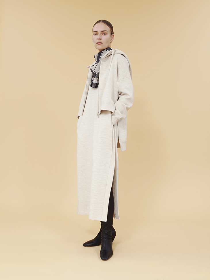 “The suits with a masculine allure, entirely made of knit, are the strong point of the brand and make the MRZ image modern and suitable for many different occasions. The essential garments are revisited in a contemporary key and made with fibers with noble compositions, starting with cashmere. In contrast to the knitwear proposal, there is a somewhat rough-looking fabric and eco-leather, a texture that refers to design objects and which, through unusual inserts and cuts, completes the vision of the brand. Unusual suggestions, stolen from the interiors, are also proposed in the textures and stitches while a “casentino” finish or a floating yarn effect enhances the three-dimensionality of the material.” – from MRZ