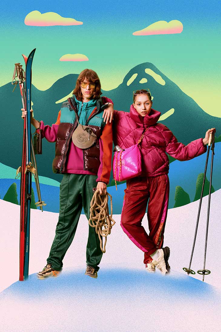 The film is about the magical transformation of a cable car into a “space” disco suspended in a remote galaxy, where the boredom of waiting turns into a crazy, wild dance, which none of the passengers can sit out. OOF WEAR immediately becomes of extra-terrestrial interest. Passengers sport the new collection: long puffer coats in pop shades and jackets bright with colour, floral and spotted patterns featuring original material combinations. Cosy eco-fur, perfect for her but also ideal for him, alongside padded jackets in bright nylon that conceal a completely recycled soul. Pants reinterpret the technical approach in a colour-block version with sportswear details while maintaining an 80’s vintage vibe, and come in a range of fits from slim leggings to loose and baggy. – from OOF WEAR