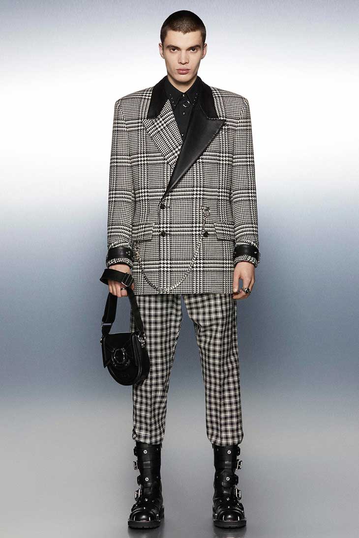 “References to a punkish bondage aesthetic are juxtaposed to dramatic florals and sartorial checks for a seductive eclectic vibe. Cashmere, wool and mohair sweaters and cardigans, showing colorful tartan patterns and furry-like textures, are conceived with coziness and versatility in mind. Sophisticated brocades introducing a gentle, feminine vibe into the collection are crafted for urban bomber jackets and languid robe coats. Suggestive decadent flowers injected with a Brit touch blossom on sporty pieces, such as practical windbreakers, but also on silk pajama-like sets and separates where florals are juxtaposed to prints with a bondage vibe. That iconic pattern becomes 3D through hardware applications and laceup details giving a signature look to a range of leather styles, spanning from Puglisi’s iconic biker jackets to pants showing tulle inserts for a sensual see-through effect.” – from Roberto Cavalli
