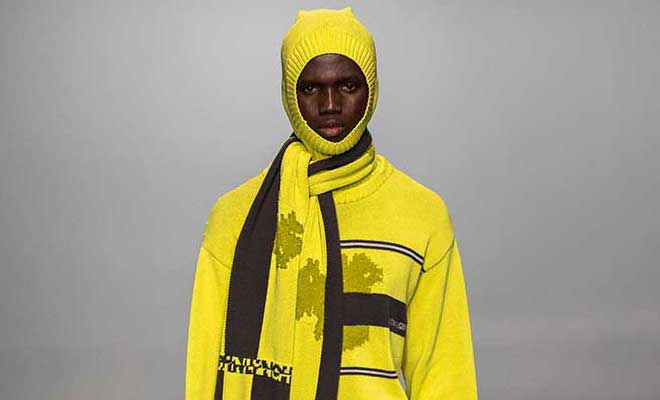 Dublin born menswear designer ROBYN LYNCH presented her Fall Winter 2022.23 Collection, that explores Irish references and culture with a modern touch, on February 19th, during the recently finished London Fashion Week. For the season the designer was inspired by her collaboration with American sportswear company Columbia, and by their use of fabrication and technology. The collection includes 10 upcycled jackets created in collaboration with Columbia, all made from deadstock materials. For the collection Lynch also reimagined her dad’s vintage Dublin football jerseys as high-tech knit looks.