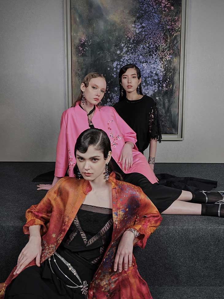 With the brand’s classic embroidery techniques, the ocean of Wisteria in “Flowerful” is portrayed in plethora while the sheer organza print depicts the light and shadow of the blossoming flowers, echoing the pure of heart in mankind depicted by the painter. Reflecting the collage and layering of paints in “New Shoot”, the clothing adds force to the paint strokes on the fabric with delicate hand embroideries and original jacquard, increasing levels and thickness to further embody the determination of life with force and context. – from Shiatzy Chen