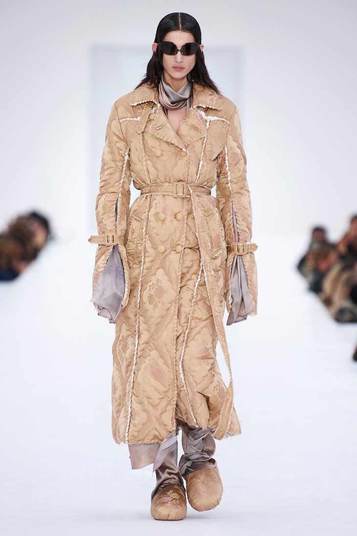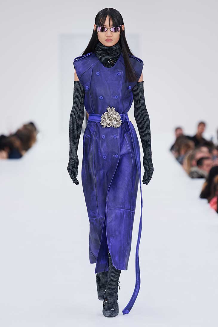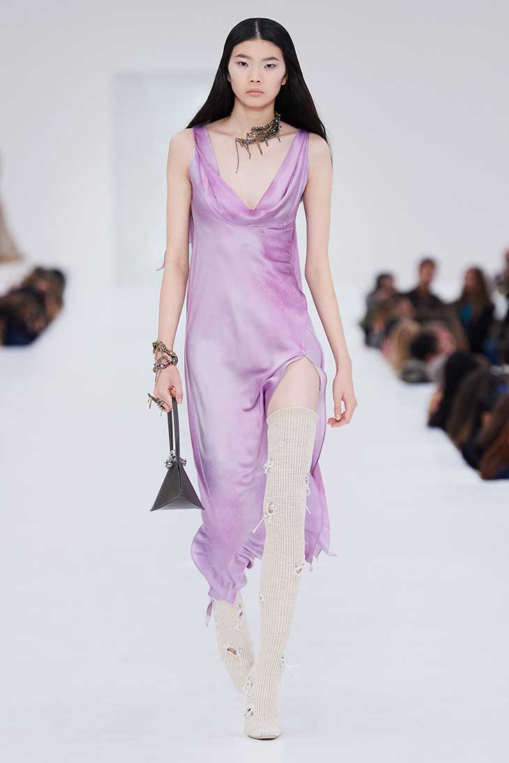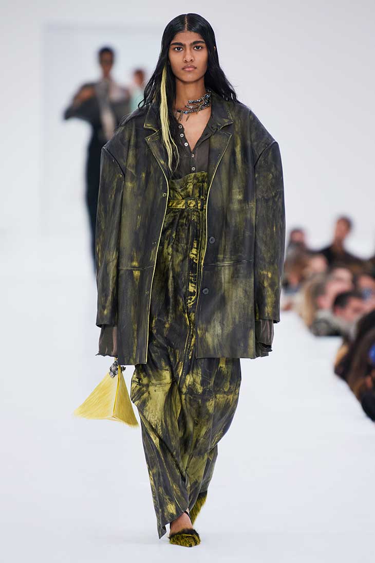 Discover ACNE STUDIOS Fall Winter 2022.23 Collection, that explores emotional patchworking, presented on March 2nd, during the recently finished Paris Fashion Week. The collection brings a collage of ideas and feelings, and captures patchworking and repairing as acts of self-expression. It also shows the beauty of raw seams and exposed padding. The contrasting textures reveal the complexity of character. The collection is made from upcycled denim and leather, distressed jersey, cotton knit, silver hand-painted leather, silk crepe, upholstery jacquard, and foam. Key pices include floor-length paper bag skirts; distressed knits repaired with crystals; quilted upholstery coats; fringed scarf dresses; bustier top ballgowns in patchwork denim or knit.