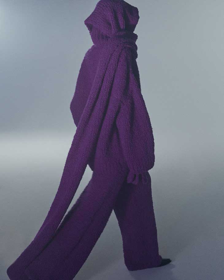 Knitwear remains an integral focus. Various weights and shapes, from hand knits to intarsia knits to checked jacquards. Full look silhouettes in big chunky knits. Meticulous crotchet handwork, striking color blocked intarsia, grizzly textured boiled wool. Playful big fringes and wools with textured bouclé effect. Key take- away is a luxurious 15 ply cashmere sweater, covetable and inexplicably soft, almost like wearing a cloud. Cocoon sleeves and oversized shapes give a sense of warmth comfort, shelter and mystery. This season’s outerwear is a constant pairing of contrast and proportions. – from Christian Wijnants