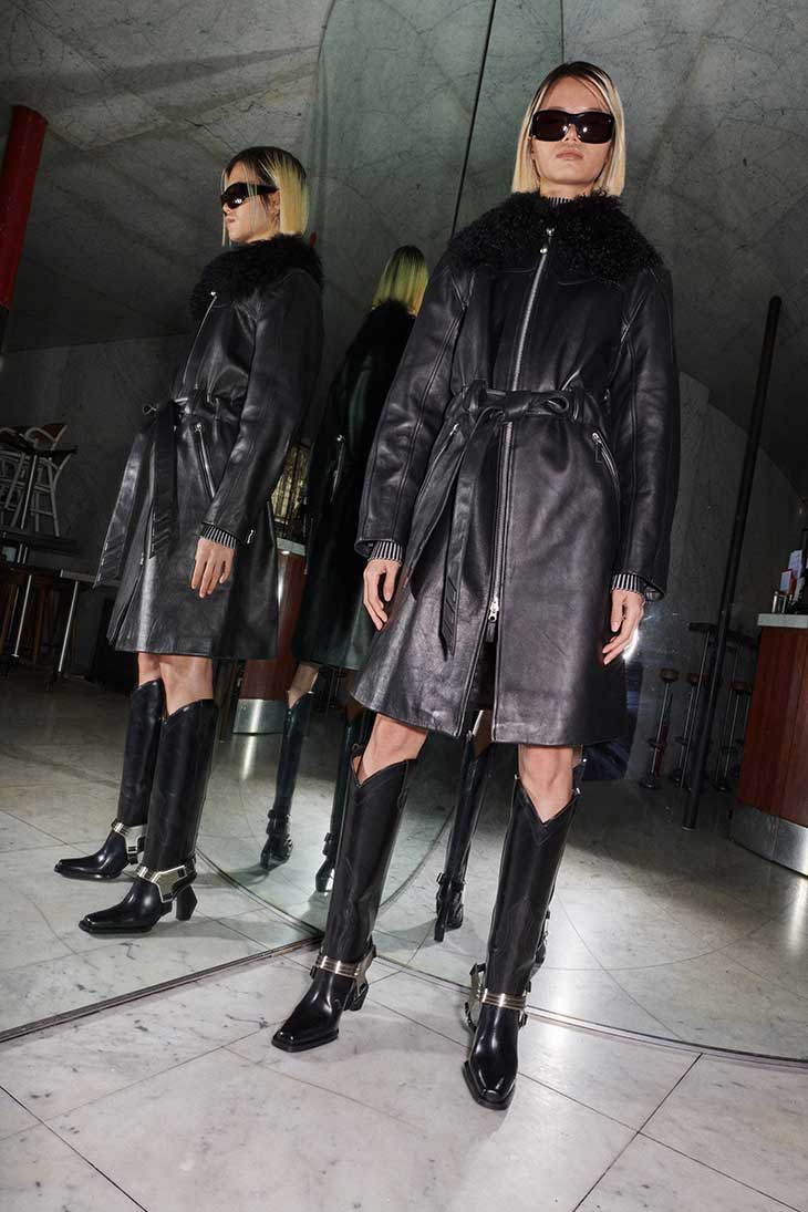 “Classic business shirts are adorned with allover laser slashing and 3D knitting techniques are explored, while tops and dresses in layered sport mesh creates an optical illusion of nightly moaré waves. The collection is built around juxtaposing style formulas. Balancing mended baggy workwear denim, a sculptural pinstripe power-blazer and a pair of western boots with leather-dressed stilettos extending backwards in a standfast position–ready to sprint. The lineup features smoggy over-dyes, all-over ocean print, as well as laser torn surfaces mimicking soft bouclé, experimenting with new ways to progress the ultimate vintage denim look. Around it is a power play of silhouettes; Cropped jeans and utilitarian jackets with ground licking power tailoring, blazing through cityscapes in a pair of heeled western boots adorned with modernist metal harnesses. Riding EYTYS out in the city nights.” – from Eytys