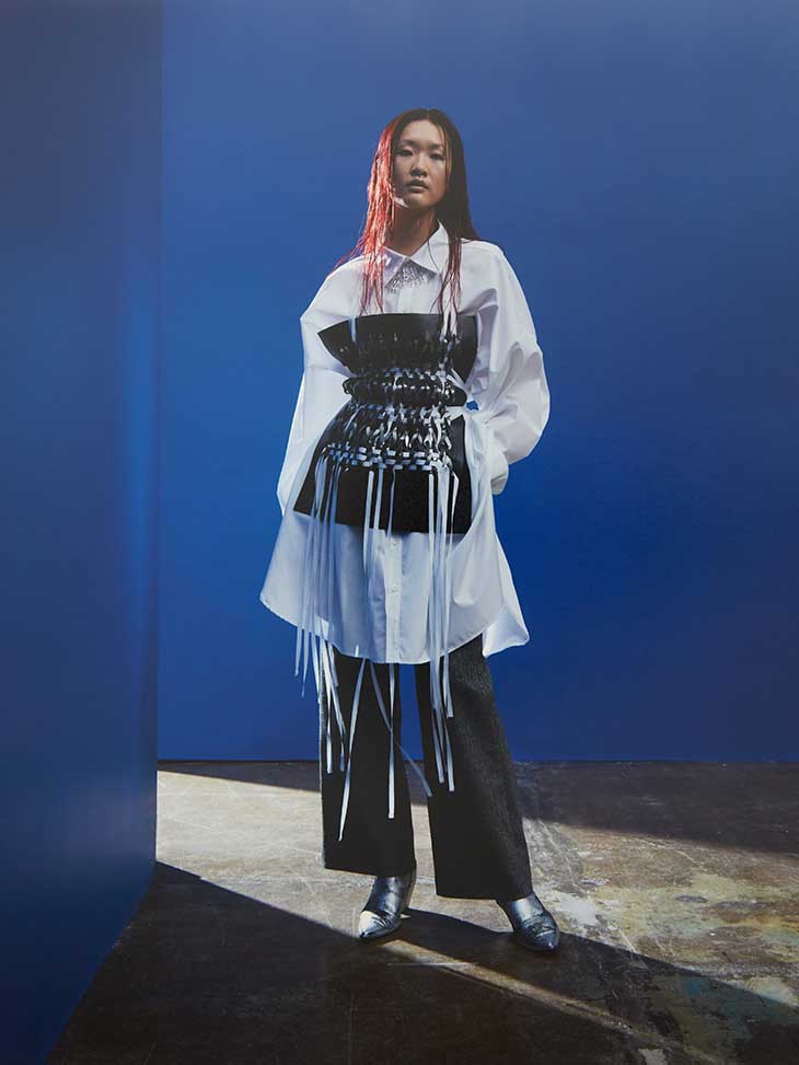 The collection presents a refined sense of tradition, an exploration of class and dark twisted vision on the past and future. By exploring Canada’s history through a punk lens, it serves the purpose of bringing a sense of community. Between movement and dimension, this collection is bringing traditional wear to the Lecavalier universe through intricate leather weaving, distorted plaid patterns and oversized silhouettes. – from Lecavalier.
