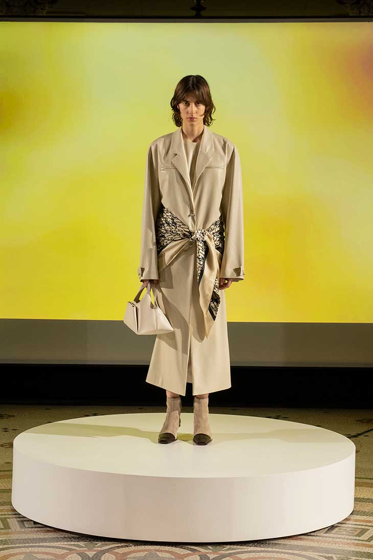 “The Fall/Winter 2022 collection demonstrates creative tension in layering. Fabrics like slip satin and regenerated leather communicate with plush textured fabrics like suede, tubular jacquard and an exclusive short-haired faux fur. Shirts are styled with midi skirts, with a swathe of fringing at the hem; floor-pooling turtleneck sweater dresses are worn over vegan leather trousers; men’s tailored trousers are defined by front-slit hems; single-breasted jackets are styled with extreme overlaps to give the appearance of a double-breasted silhouette; workwear-inspired pullovers are refined in slip satin; and trench coats are rendered in a glossy patent canvas. Dangling buttons, ceramic detailing and decorative crochet stitching – a play on the seam detailing from the newly iconic Origami Tote – showcase a renewed focus on creative hardware. This collection could not have been created without the dedication of Ahinaa Perjési and the Nanushka Design Team, who have supported consistently throughout Sandra Sandor’s maternity leave. An exclusive collaboration with Athens-based jewelry brand, Vasiliki, strengthens the essential energy of Industrial Craft, featuring imperfect, hand-dripped 18ct gold and recycled sterling silver necklaces, bracelets and earrings that theatrically defy mass production.” – From Nanushka
