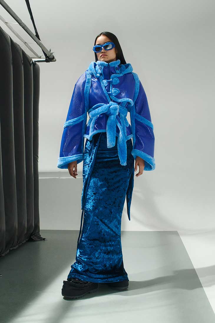 To wear Ottolinger is to enter the world like a car alarm; moving in an operatic blaze. To wear Ottolinger is to walk through that door holding that purse, placing it on that beveled glass table just as the pen is pressed to paper. Contracts signed. Doors opened. Slippery materials forming a rugged and new hyper reality. FW22 is the final layer of that dizzying membrane that catches the sun, enabling performance and drama to shimmer shoulder to shoulder. It is a second skin, strapped and tied in an endless knot of amplification.