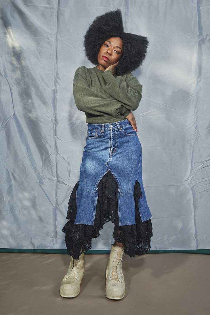 Discover RENTRAYAGE Fall Winter 2022.23 Collection, that was inspired by the carelessness of the ‘90s and its sharp contrast to today, presented at New York Fashion Week. The collection mixes laces and metallics with vintage denim. The silhouettes are bound by external corsets and belts. Designer Erin Beatty explores both freedom and restriction, and connects the past, with the present, and future. The looks that are created from real vintage garments, bring sophistication rooted in reality. Photographer Djeneba Aduayom captured the lookbook featuring Sudan Archives and Cat Parks.