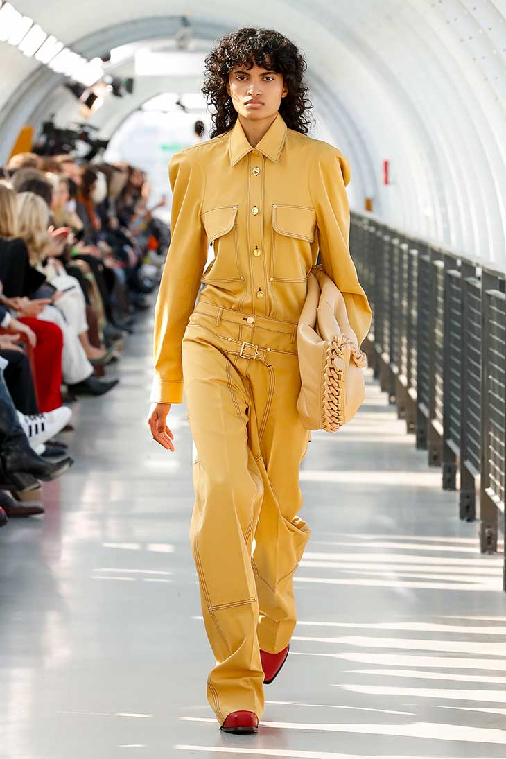 Sexy was brought back through encrusted lace on bias silk slips, form-fitting forest-friendly viscose lilac ribbed all-in-ones and ruching and twisting on soft pink velvet tops and dresses. Sensuality continued on fluid chintz dresses with ruched sleeve details, red double satin dresses with asymmetric bust lines and long skirts revealing the knee with each step, while romanticism came from exaggerated sweetheart necklines An artist’s workwear uniform was elevated with functional details and rich fabrics – including jackets and cargo trousers in velvety soft flocked denim, alongside skirts and polished cotton utilitarian pants with contrast stitching and recycled polyesterclip belts. Industrial shirts with oversized lapels and exaggerated breast pockets also delivered a refined pragmatism. Outerwear highlights included fluffy wool Fur Free Fur on shearling coats, long peacoats and shrunken men’s jackets.” – from Stella McCartney