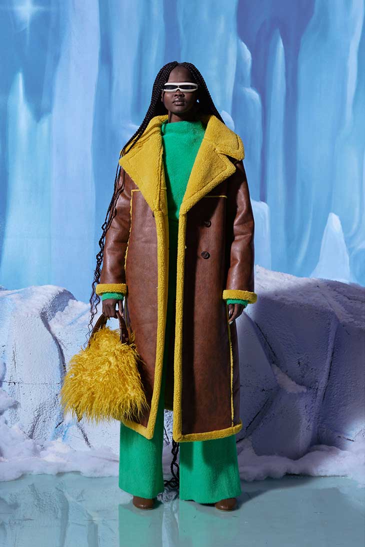 Fashion designer Chelsea Hansford presented SIMON MILLER Fall Winter 2022.23 Womenswear Collection with Life on Mars lookbook. This season’s collection stays true to brands colorful DNA, bringing fun, wildly textured, oddly proportioned pieces and accessories. The key pieces of the collection are bedazzled denim jackets and jeans, chrome clutches, shearling bags and Yeti boots. Of course, no Simon Miller collection can pass without the famous bubble clogs, that come in several shades of shearling.