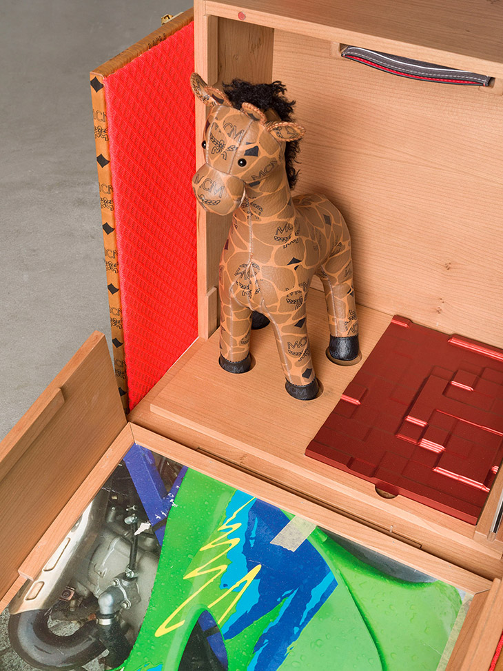 “The interior of the case is lined with mirrored leather and orange mesh. As a reference to the brand’s flagship store, an inner lid picks up the façade of the MCM building in Seoul. Wohnseifer additionally picks up the shapes of the windows in his cover design for a vinyl record included in the case. It contains an unreleased track by the DJ duo and friends of the artist, Schaeben & Voss. Two artworks by Wohnseifer are part of the selection. The first is a unique aluminium painting, which the artist exclusively created for this collaboration, in individual combinations of different shapes and colours. The second included is a Diasec print limited edition of a photographic collage by Wohnseifer. It is based on a car spotter’s picture of a luxury car in New York, printed with the MCM monogram. As a new addition to the MCM Zoo, Wohnseifer has designed a leather toy giraffe. The artist specifically opted for the oracular animal of Greek mythology to represent the gaze into the future, while a poster with motifs from the earliest MCM catalogues captures impressions from the brand’s history. Finally, a metal card in a red and silver MCM leather case indicates the edition number of the DJ case.” – from MCM