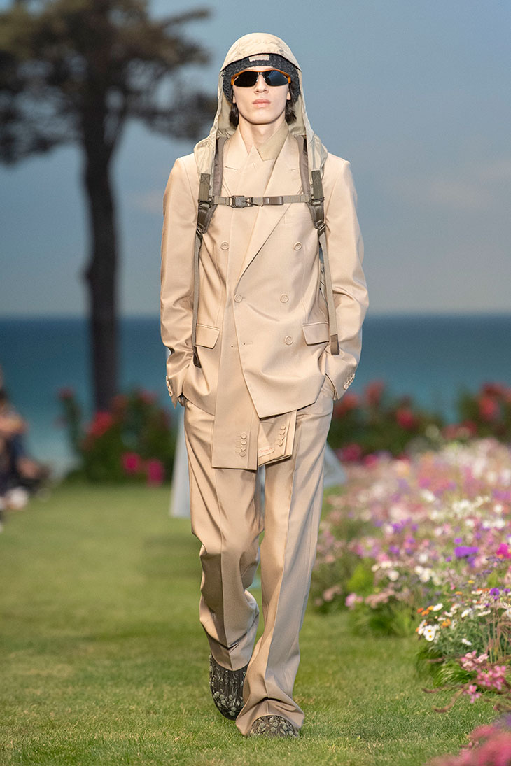 Inspired by nature, the colour palette includes the gradation of Dior grays, pinks and pastels, to the utilitarian gardening, walking and fishing, greens and blues. The collection features cashmere, double-breasted tailored coats,, teamed with tailored shorts in thirties fabrications – with built-in turned-down waistbands and walking shoes.