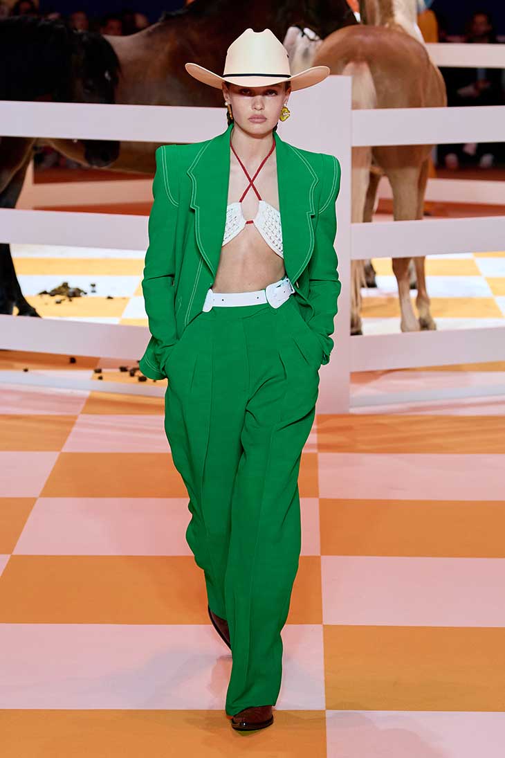 Luxury fashion house Casablanca presented their Spring Summer 2023 Menswear Collection titled Futuro Optimisto, on June 25th, during Paris Fashion Week. The collection features a special delicate lattice beadwork and hand embroidery, thread, every bead and fringe is dyed to match the colours and gradient of the season. Silk that was hand-crafted in Lake Como interprets watercolour scenes by Oaxacan artisans. Knitwear is presented troughout tracksuits, dresses and swimwear while crochet can be seen through ready-to-wear, bags and hats. With this season brand wanted to subvert the notion of the classic bride into a new vision but still aligned with the classic couture craftsmanship of bridalwear. The gown is embroidered with delicate lattice-work transforming the boundaries of tradition. Veil is carefully crafted by renowned London-based milliner Neil Stewart, utilising delicate lace sourced from Switzerland, a dedication to the finery of 20th-century brides.