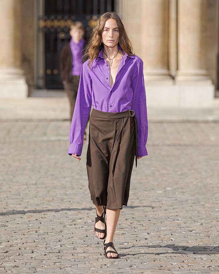 I am particularly fond of this collection that I greatly enjoyed developing. The delicate nonchalance coming through the volume of my women’s pants is mirrored in my men’s. I found myself finally over needing to identify in each of the collection pieces, enjoying more freedoms in menswear, in the cuts but also fabrics and patterns. These novelty pieces have been a delight to wear. However, I don’t feel the urge to change everything, of course. My favorite fabrics are still present, light and crisp poplins, some fayorite fresco wools, cottons and linens threaded with a touch of Tencel for an extra softness. Silk also comes in to bring out a sunny and smooth side of pants to be worn both in the streets of Paris and a Mediterranean summer night. This season’s color palette standouts include a not so summery yet very chic espresso, a pink neither too pale nor too dark, alongside a celadon green for a touch of freshness. The women’s collection is taking a larger place in the show, as it finally embodies what| had been envisioning. Masculine-inflected touches further the femininity of certain shapes. Trenches are closely matching the pants highlighting the waist. Shirts are playfully over-extended. Skirts are retooling the tailoring codes. – from Officine Générale