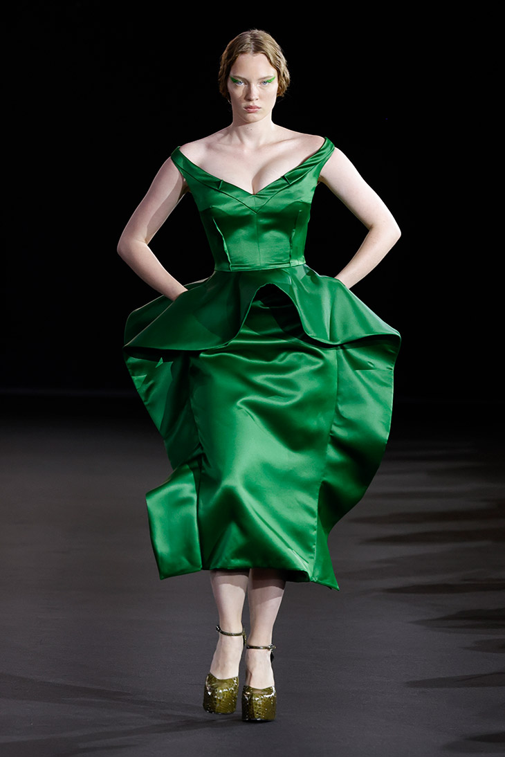 “Sculpted dresses mould around the figure like frozen weaves. Corals swarm as intricately beaded textures, or grow on the body like fragile vegetation. Transparency is paramount: the same one finds in the fauna of the abyss. Harnesses add a seducing toughness which carries in the towering platforms with a nail in place of the heel, in the oversized studs shaped as earrings and headbands. Neatly shaped handbags look prim and proper in miniature size, capacious and pragmatic in the grand version. The colour palette has a primary urge: it moves from red, yellow and green, to light blue, white and black, enhanced by the fluidity of silks, by the soft firmness on python leather, by the tautness of knit. Del Core affirms mutation once again as the simplest, truest force of life. ” – from DEL CORE