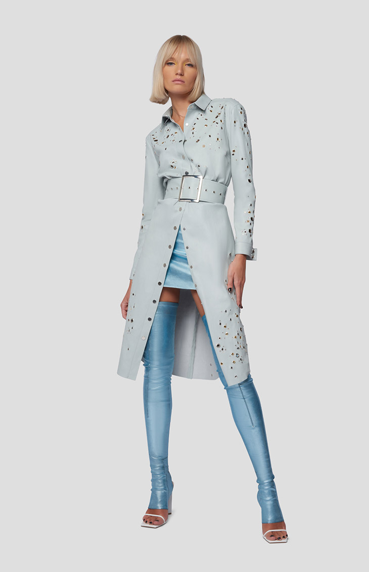 “Jitrois’ world-famous stretch leather lambkin gets a bold and bright renewal in the form of short cut-out embroidered gilet’s, cropped asymmetric tops, bright coloured micro-mini-skirts and exposed zipped fronted flared trousers. Dresses and jumpsuits take note from the 70’s disco era with cinched waist detailing, plunging neck lines and thigh grazing hems. The menswear follows suit with hyper sexy black metallic micro shorts, fitted biker pants, bondage inspired sleeveless vests and multi coloured eyeleted harnesses. The house’ iconic second skin black stretch leather plays harmoniously with luminescent tones of metallic blue and black, vivid flashes of ultramarine blue, cyclamen, sky blue, lime green and candy apple red alongside familiar tones of blood red, lemon yellow, kaki green and white.” – from Jitrois