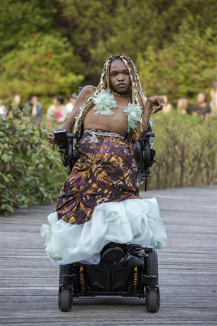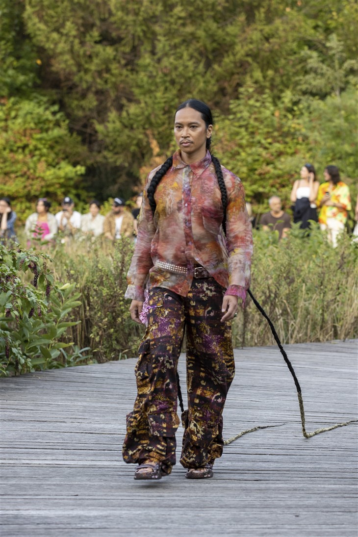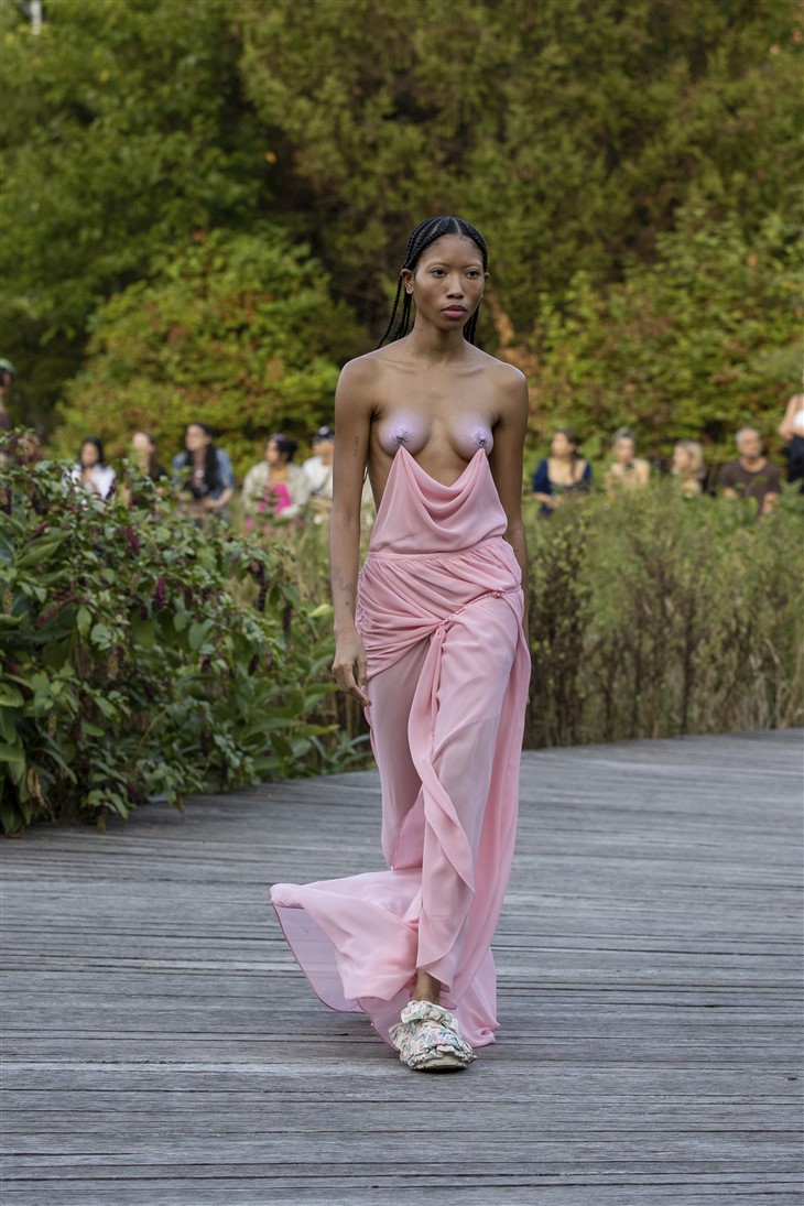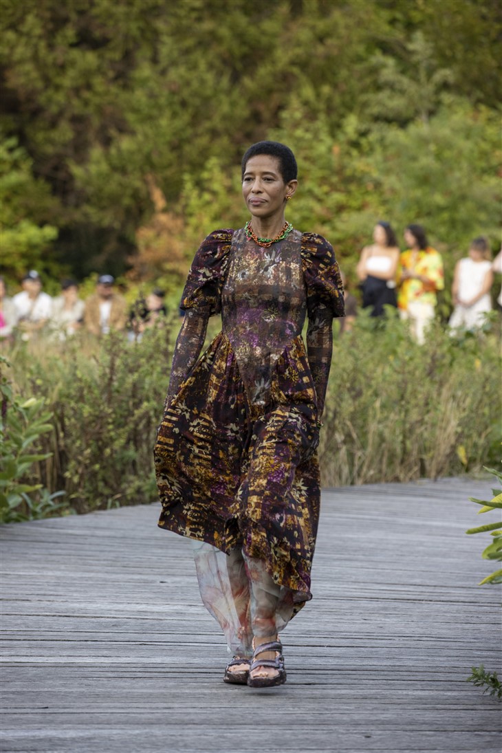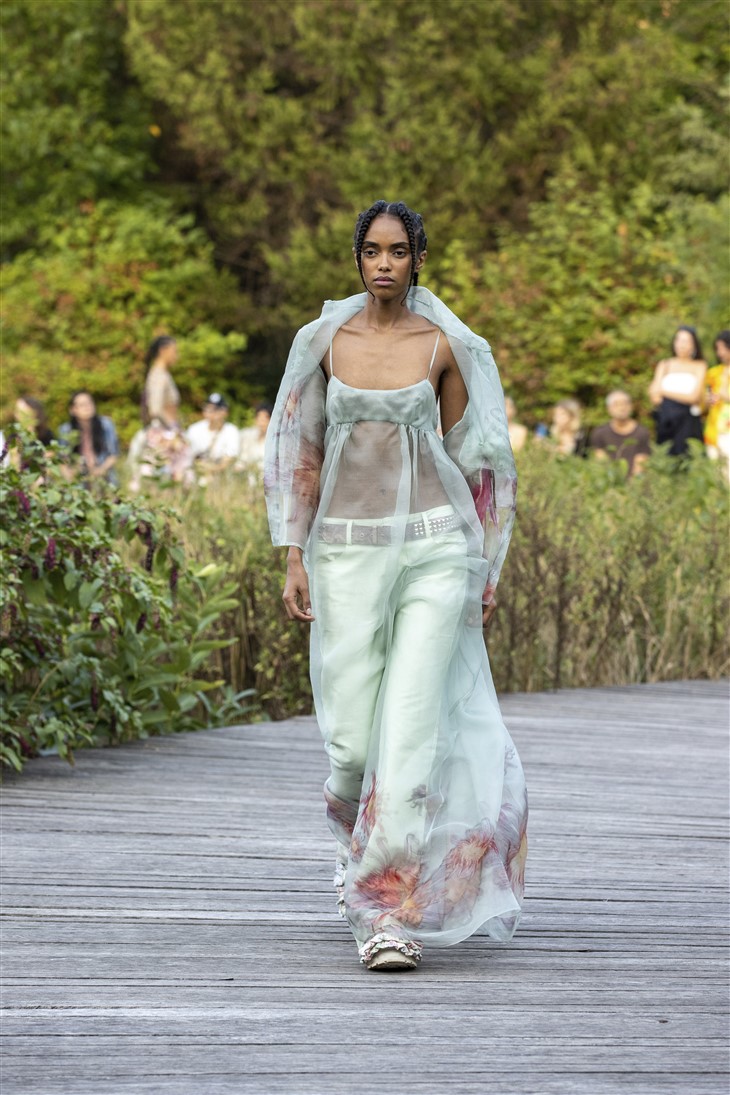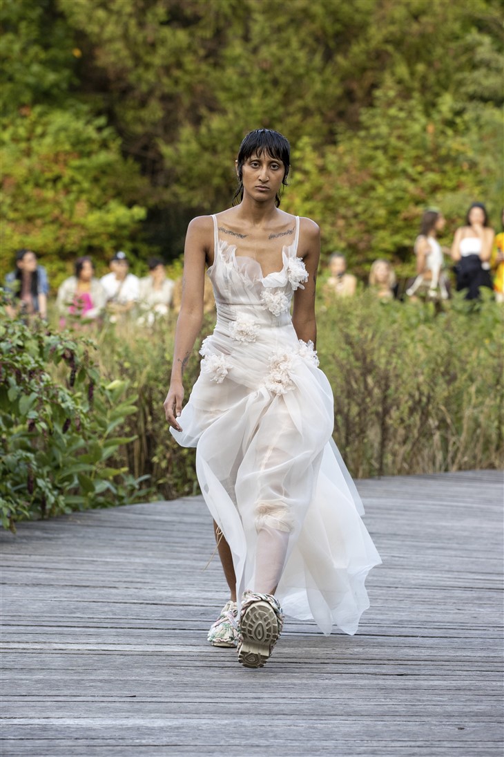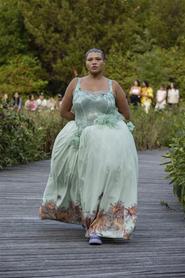 Models flutter through the garden in floaty gowns made from orange fiber organza, ready to rule the red carpet in responsibly-crafted, regenerative pieces that can conquer Hollywood without wrecking any actual woods. The looks take us from funky caterpillar era to full butterfly glow-up, even as the collection embraces the reality that we are all in that mysterious gooey in-between place in our journey to do better by Mommy Earth. – from Collina Strada