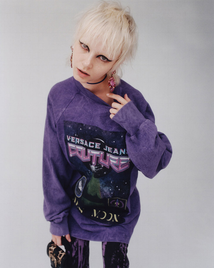 “Dressed in Versace Jeans Couture FW22 Denim collection and connecting two eras of counterculture, the pair pose beside scribbled and stamped-on graphics – each page injected with the rule-breaking energy of 70s punk. “For… who cares!” One page reads, inked in pen before an electric blue backdrop. Above, Deijuvhs is lensed standing in a baroque-stained shirt and matching jeans. Later in the zine, Milkie wears a purple, galactic print long-sleeve and sci-fi-inspired printed denim trousers and elsewhere, imagery reimagines the pages as mock-up gig flyers for both artists.” – from Versace Jeans Couture