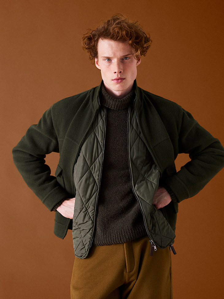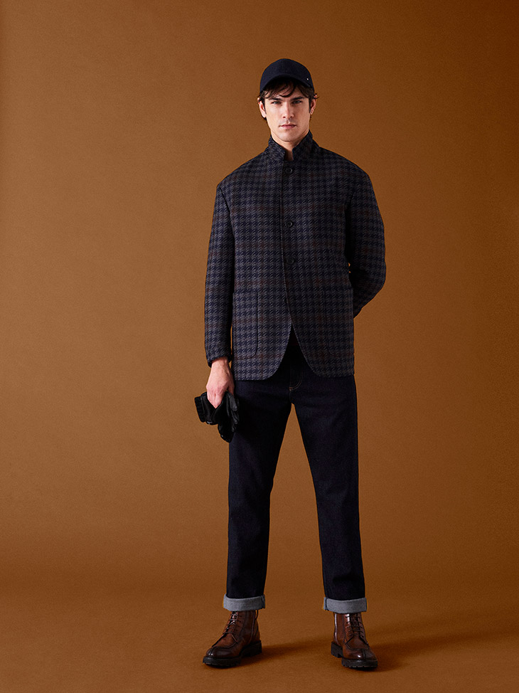 “Jackets, coats, jumpers, and trousers flow smoothly on the body, allowing movement, embracing multiple occasions of use. Diamond quilted capes are both practical and dramatic. Moving between heritage and the contemporary, jackets and coats sport traditional menswear patterns blown up to gain a neat graphic allure. The same motifs appear as jacquards on jumpers, as prints on shirts, on textile accessories. Focus is on a new formal and versatile luxury casualwear.