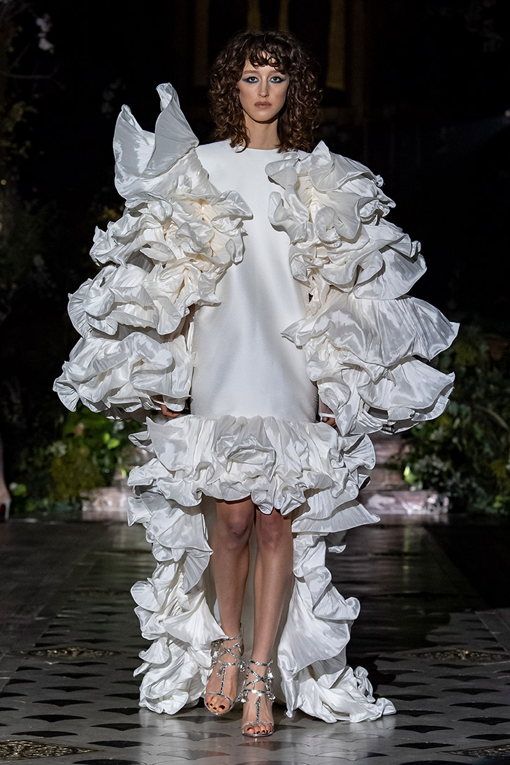 “This collection shows the essence of Juana Martín’s designs, both in the color palette based on black and white tones, as well as in the use of volumes, embroideries, ruffles and of course, polka dots. The fabric innovation and the abundant presence of crystals stand out in this collection, embroidered crystals and netted crystals, create meshes that cover the body of the sensual, daring and provocative woman.” – from Juana Martín