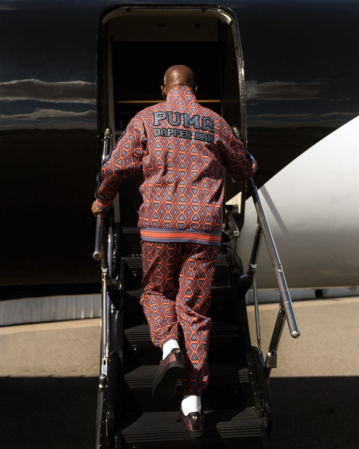 In tandem with the drop of this five-piece capsule, Dapper Dan has redesigned the PUMA jet interior with the PUMA x Dapper Dan print, accessories with co-branded logos, and materials used in the most recent collaboration. On the continuous growth and evolution of his projects, Dap states, “We came by dog and now we travel by bird,” reminiscing on times when the bus was his main mode of transportation and now his designs are in the sky with the PUMA jet. – from Puma
