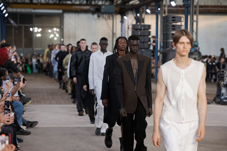 1017 ALYX 9SM Menswear footwear design masterfully continued to develop during the course of the show, and it was highlighted by the hefty sole shape. The footwear selection featured timelessly classic derby shoes and tough canvas combat boots that had been painstakingly constructed with an unwavering attention to every little detail. Footwear is a promising part of the Alyx brand, perhaps the component most likely to push forward the growth of the same.