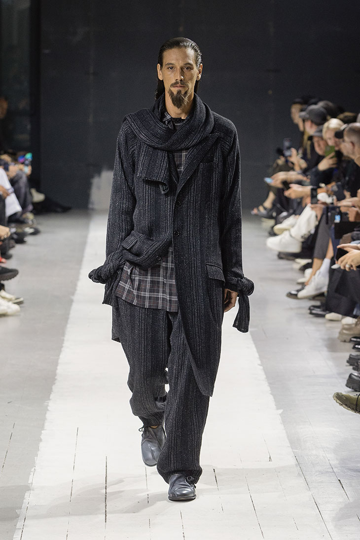 The collection showcases the designer’s unconventional approach to tailoring, with oversized trousers, waistcoats, and coats carefully adorned with stitches and oversized safety pins. Notably, blazer lapels were intentionally left with unfinished edges, while spare fabrics were artfully sewn onto garments like unique embroideries. Achieving the delicate balance between an unfinished aesthetic and impeccable craftsmanship is no easy feat, but Yamamoto’s design prowess shines through in every piece, demonstrating his ability to masterfully blend rawness and perfection.