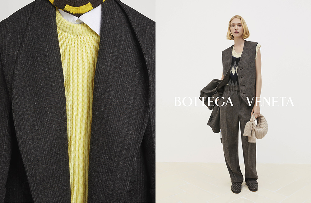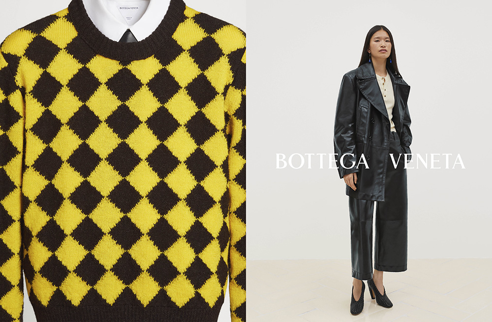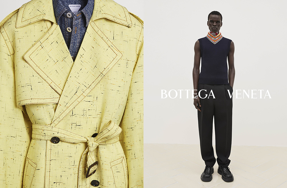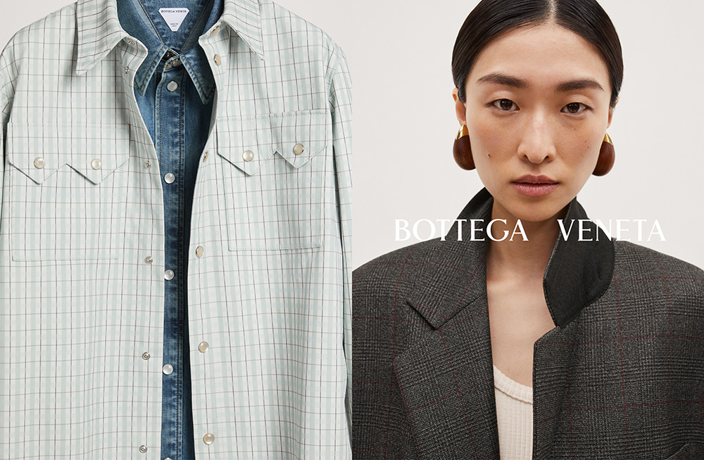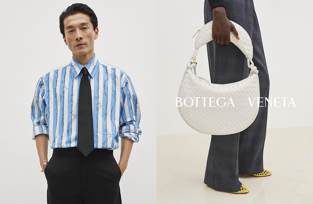 The campaign, cast by Anita Bitton, brings together a diverse array of models – including Badhiel Nyang, Chu Wong, Daisuke Ueda, Emma Balfour, Kris Wardak, Lara Menezes, Noah Ramos, Sun Mizrahi, Tess Breeden, Zhao Lei and Walid Fiher – each embodying the brand’s inclusive and global perspective. Bottega Veneta’s Spring 2024 line-up is punctuated by the interplay of textures and patterns, as seen in the checkered ensembles and the signature Intrecciato present in the woven leather accessories. A grayscale palette is enlivened with pops of bold color, exemplified by the striking evolution of the classic footwear pieces and the vibrant yellow knitwear, showcasing the label’s flair for juxtaposition.