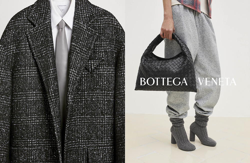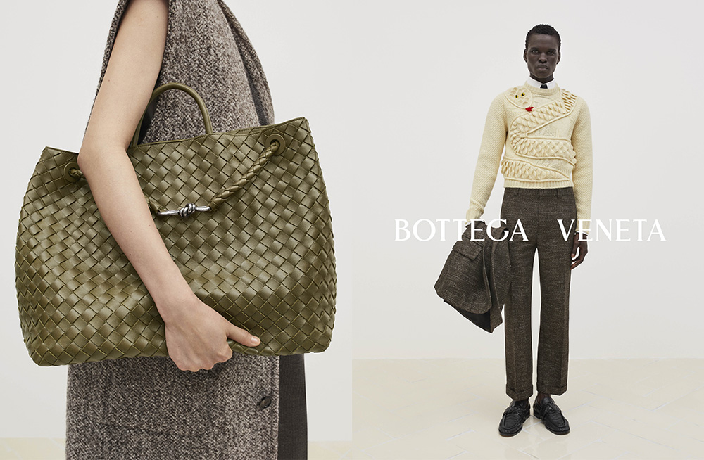 The accessories, a hallmark of Bottega Veneta, do not shy away from the spotlight. The handcrafted leather bags feature the brand’s iconic intrecciato weave throghout, now reimagined in oversized proportions and unexpected shapes, seamlessly blending functionality with high fashion.