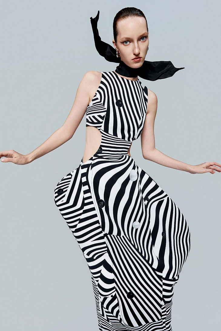 For Spring Summer 2024, Annakiki has presented us with a collection titled “Alien Body.” With 48 looks in total, the collection presents us with a play on contrast, shape and texture. The color pallette mainly consists of black, white and metallic silver in various combinations. Patterns on clothes create optical illusions, reminiscent of Vasarely paintings, while cutouts, exaggerated shoulders and 3-dimensional spikes transform the silhouettes.