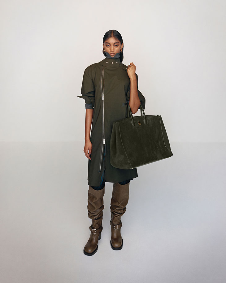 The collection’s bags are as diverse as they are stylish, with the addition of the structured Shield Case bag and the mini Shield Sling bag with tassels. The Knight bag returns, accompanied by the new Rocking Horse tote and the leather Snip clutch. The Trench tote, inspired by the Burberry icon, is available in leather or garment-dyed cotton canvas. Bag colors like loch, hazel, thicket, and military reflect an outdoorsy vibe, while richer shades like kingfisher add a pop of color.