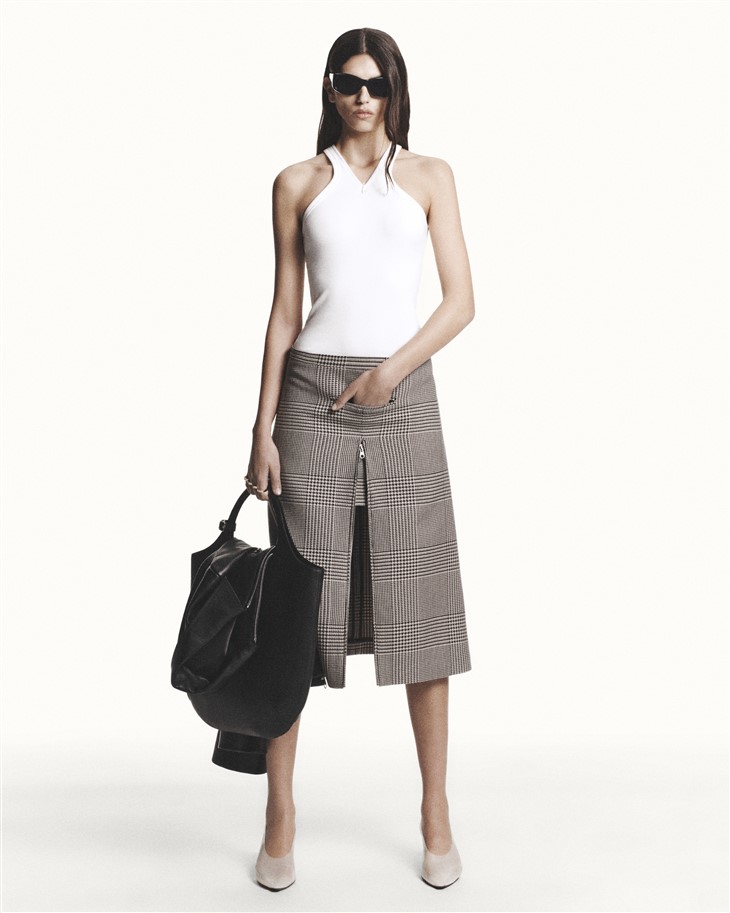 The collection begins with the precise outlines of a Prince-of-Wales suit coat and pencil skirt, designed to zip and unzip at the wearer’s will. It features open slit sleeves, a key detail from FW’23, and a jetted pocket under the navel, offering a risqué take on practicality. The styles follow a unisex approach, with convertible jersey tanks, vinyl and crepe classics, and contemporary volumes, accompanied by the Holy Bag, first seen on the SS’24 runway, now available in various sizes and colors.