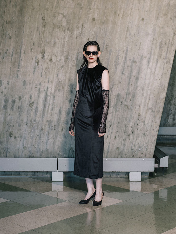 Designer Arashi Yanagawa integrates details and textures from furniture created by his favorite artists into the collection. The cantilevered jewelry, inspired by Mies’s “MR chair,” and the velvet dresses and skirts, elevated from the curtains in “Café Samt & Seide” by Lilly Reich and Ludwig Mies van der Rohe, are prime examples. Other notable inspirations include Arne Jacobsen’s “Ant Chair” transformed into “three-legged” high heels, Marcel Breuer’s “Wassily Chair” as a belt, and Charlotte Perriand’s “Les Arcs Chair” as leather accessories.